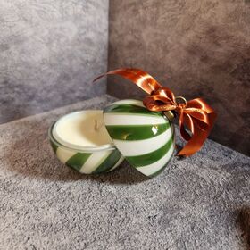 Сияющая красно-белая спираль и форма ёлочного шара создают атмосферу уюта и радости, а насыщенный зимний аромат погружает в воспоминания о праздничных ярмарках, мандаринах и тепле домашнего очага. После прогорания свечи тару можно использовать как стильную новогоднюю шкатулку или елочную игрушку.